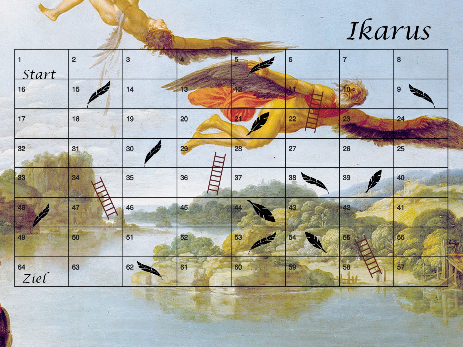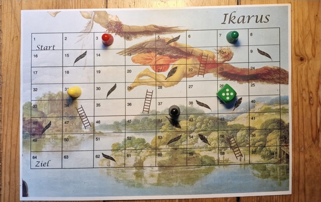 Wer von euch lebt die Freiheit des jungen Ikarus am meisten und fliegt so hoch und schnell er kann? Aber Vorsicht – achtet auf die mahnenden Worte eures Vaters Dädalus und geht kein zu großes Risiko ein! Denn würfelt ihr eine Fünf oder Sechs, landet ihr ganz schnell wieder auf dem Hosenboden. Bei diesem Spiel ist Balance gefragt: Wie viel Risiko ist hilfreich, um als Erster ans Ziel zu gelangen? Und wer ist clever genug, um die Federn und Leitern auf eurem Weg bestmöglich einzusetzen?
