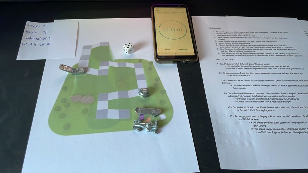“Zeitig zu Zeus” ist ein analoges, zeitbasiertes Laufspiel, welches sich mit dem Thema der griechischen Mythologie auseinandersetzt. Man lernt die verschiedenen Götter des Olymps kennen und erfährt, welche Art von Gott sie wirklich sind. Zeus, der oben auf dem Olymp haust, wartet sehnsüchtig auf seine Ambrosia (die Speise der Götter). Es ist nun eure Aufgabe euch auf den Weg zu machen, den Olymp mit all seinen Gefahren zu erklimmen und dem Gott Zeus das heilige Ambrosia zu bringen. Aber seid wachsam, denn auf dem Weg versteckt sich so manche Gefahr, die es ebenfalls auf die heilige Speise der Götter abgesehen hat.
