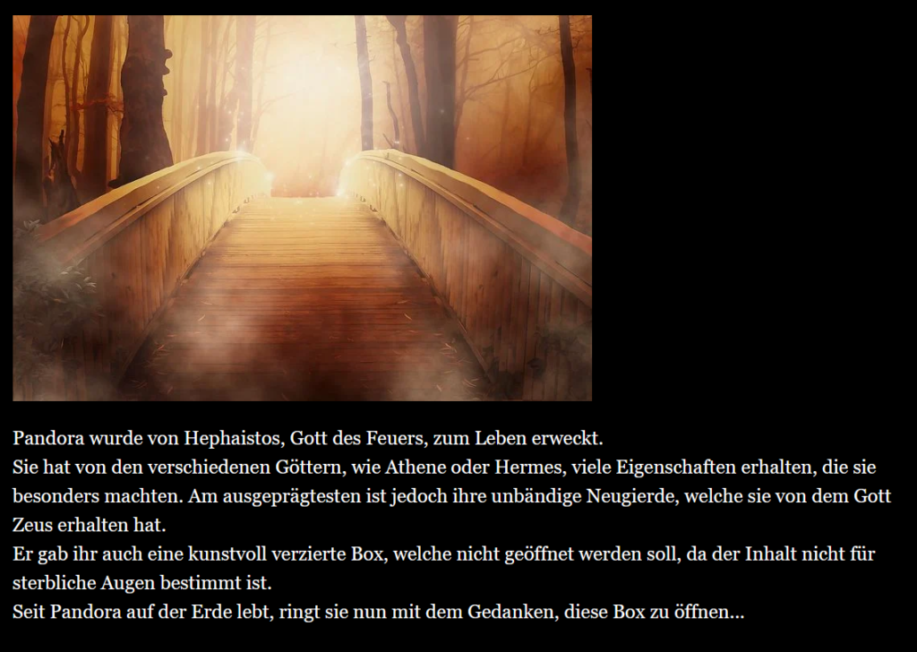 In unserem Spiel taucht der Spieler in die griechische Mythologie ein. Der Kern des Spiels ist die mystische Box, welche die Göttin Pandora von Zeus erhalten hat und welche Sie nicht öffnen darf. Der Spieler trifft die Entscheidungen für Pandora und kann selbst entscheiden, ob er das Risiko eingehen soll, die Box zu öffnen oder nicht. Dabei trifft er auf verschiedene knifflige Situationen.